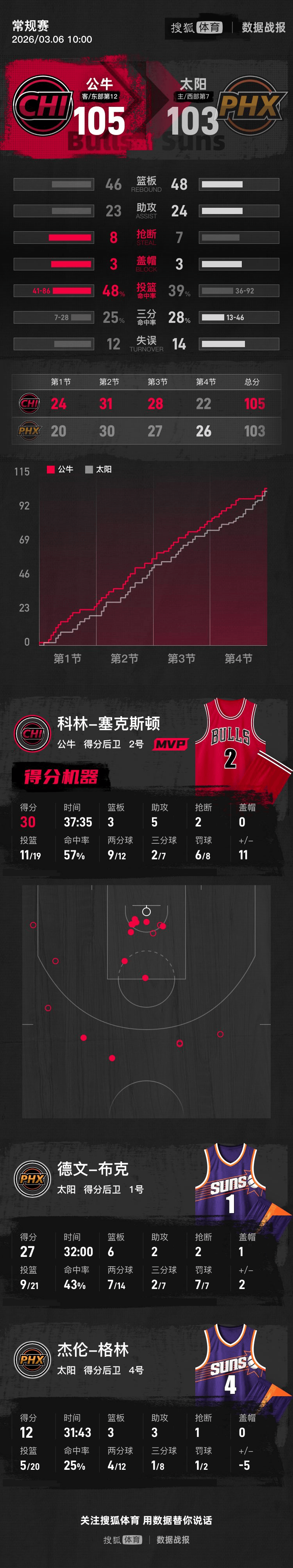 全场具体比分(太阳队在后):24-20 、公牛外线续上三分打出小高潮 ,28-27、